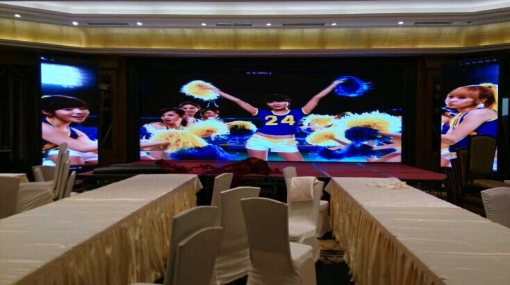 此次P4室內全彩是由彩光科技有限公司全權承制,此主屏有:長:7.424m*高:2.688m=19.96㎡,耳屏有:長:1.28m*高:2.688m=3.44㎡,安裝于重慶市梁平縣名豪酒店內,可以用來主持婚禮,招開記者招待會,舉行宴會等。給大廳錦上添花。